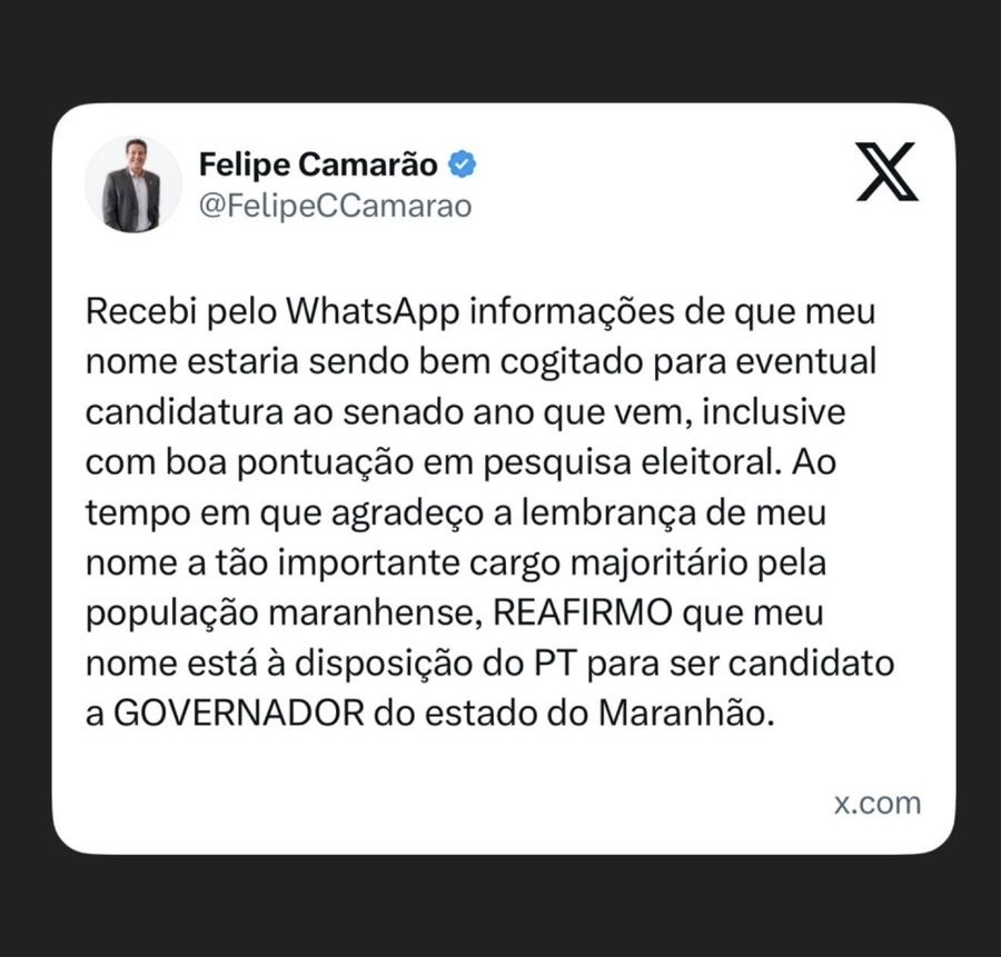 O vice-governador e pré-candidato ao Governo do Maranhão, Felipe Camarão (PT), utilizou as redes sociais para comentar especulações que circularam sobre uma possível candidatura sua