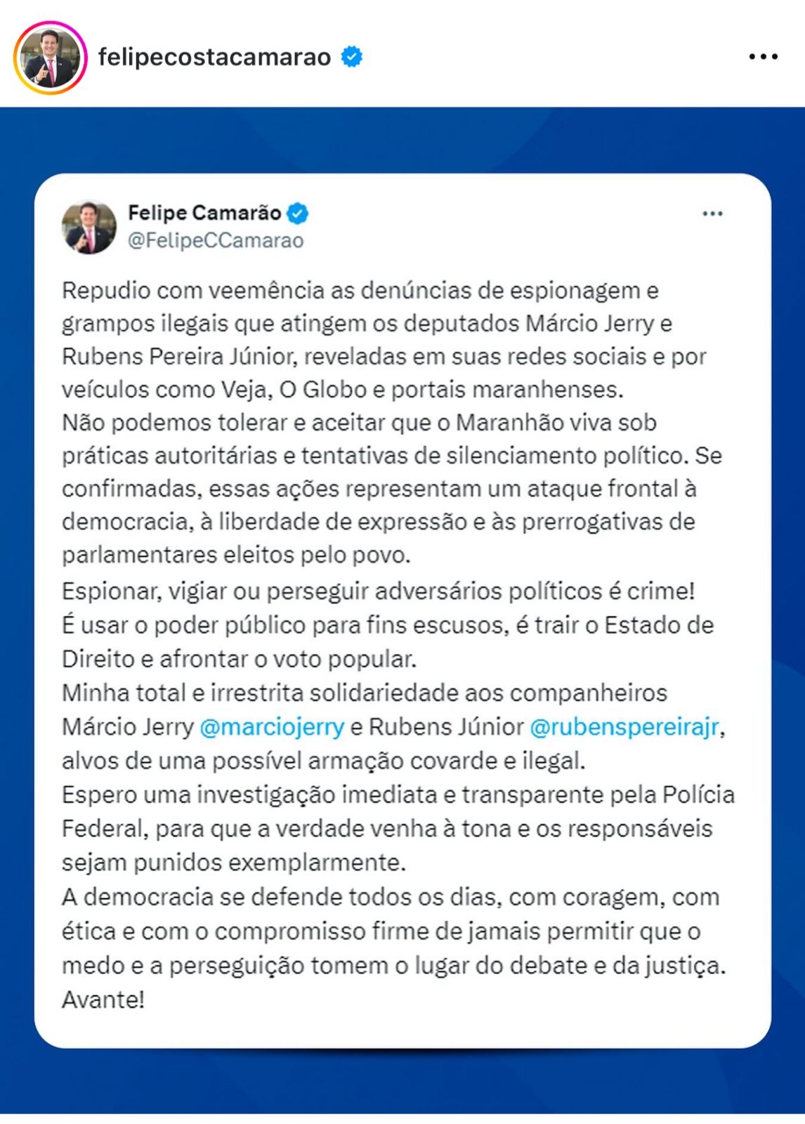 O vice-governador do Maranhão, Felipe Camarão (PT), manifestou nesta terça-feira (14) repúdio veemente às denúncias de espionagem e grampos ilegais que teriam atingido os deputados