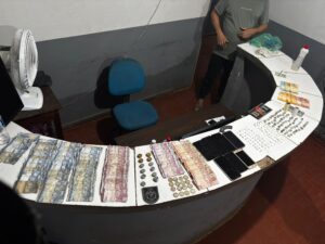 Com a autorização do próprio indivíduo, os policiais realizaram buscas e encontraram um verdadeiro “estoque” de drogas prontas para comercialização: 52 porções de crack, 23 de cocaína e 58 de maconha. Além disso, foram apreendidos oito celulares de marcas diversas, R$ 665 em dinheiro trocado, dois rolos de papel-filme e uma balança de precisão.